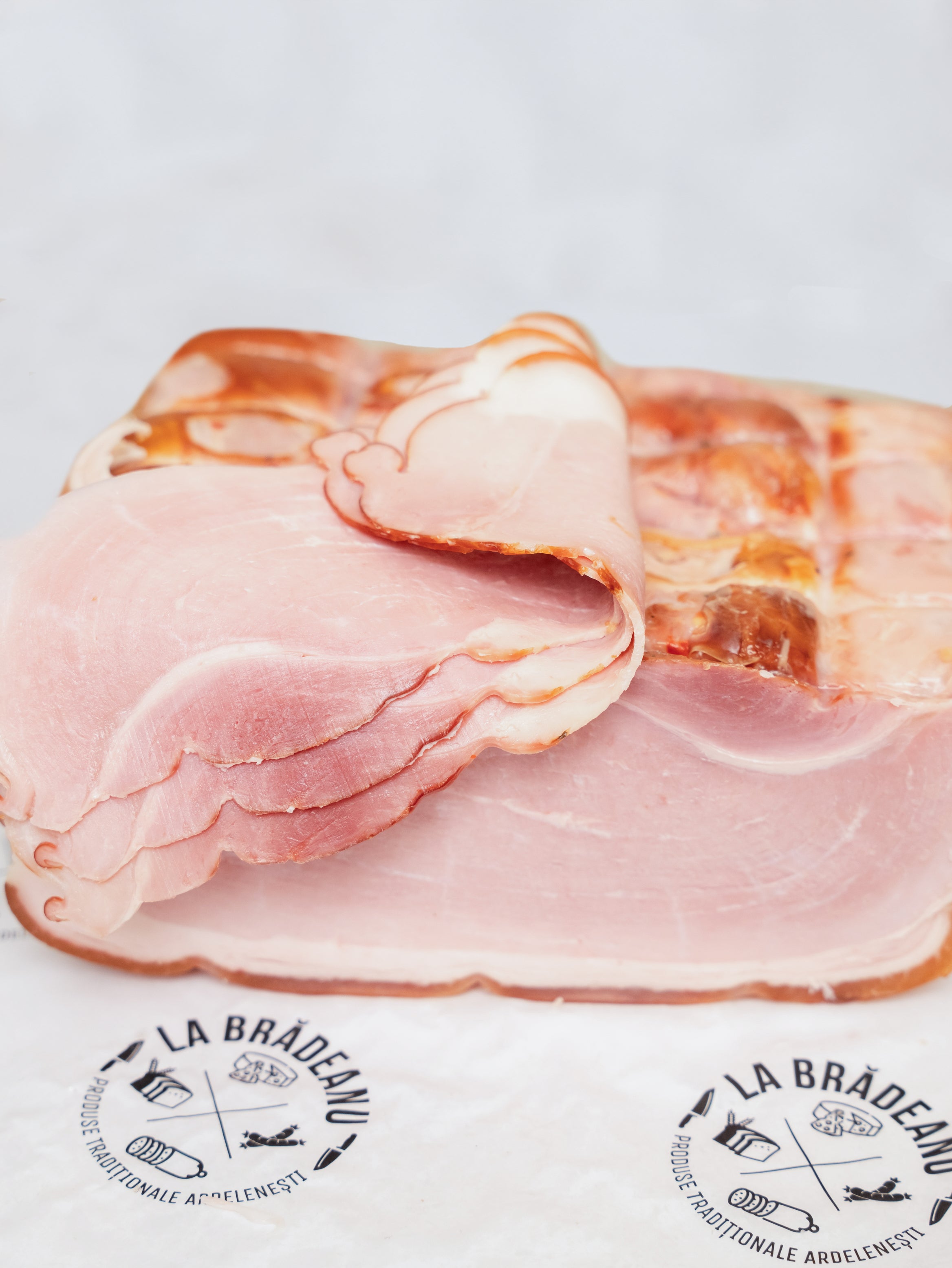 Pulpă presată, semi-afumată, fiartă cu condimente. Produsul vine feliat, specificați în notițe la checkout dacă nu doriți feliere.