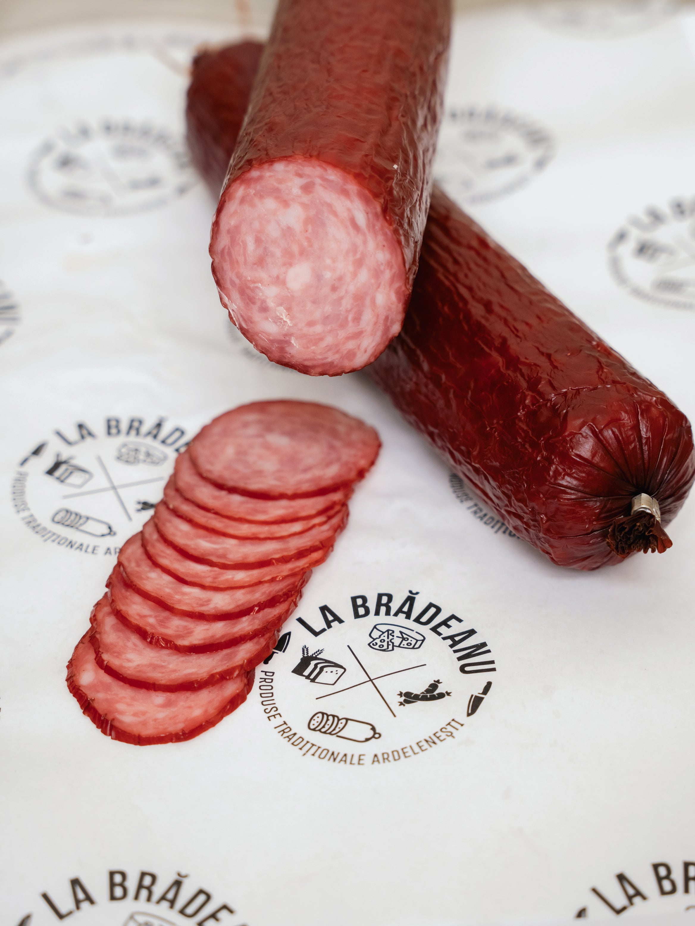 Salam de porc, semi-uscat. Produsul vine feliat, specificați în notițe la checkout dacă nu doriți feliere.